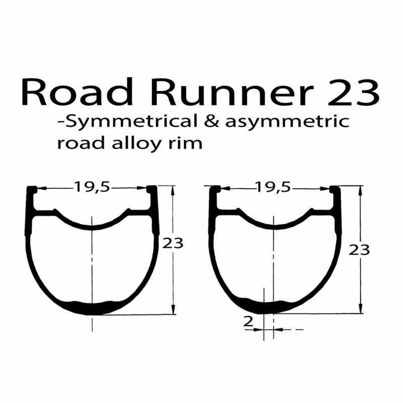 The DUKE Road runner 23 rim is designed, tested in France, DUKE is the exclusive owner of the manufacturing tools. The DUKE Road Rim Runner 23 Has a profile height of 23mm. Symmetrical front profile and ASYMMETRIC at the rear: As the number of gears increases, The cassette-side flange of the hub is increasingly "pushed" towards the inside of the wheel have an asymetrical profil (2mm offset) Which makes it possible to increase the lateral stiffness of the wheel without gaining weight. The holes in the rim are off-centered, this makes it possible to close more the umbrella formed by the Spokes. Thus the spokes ensure a better maintenance of the rim and the lateral stiffness of the wheel is increased. Inner width 19,5mm. This gives more volume to the tires and improves efficiency, comfort and cornering grip. A wide rim also means that you can use finer, lighter tires while maintaining the comfort, softness and grip provided by a larger volume of air.
