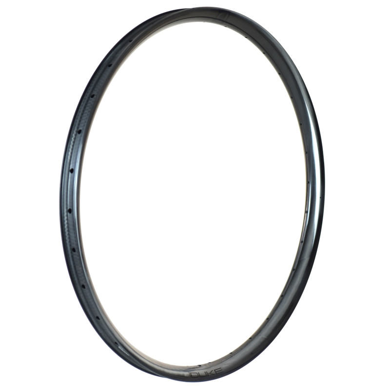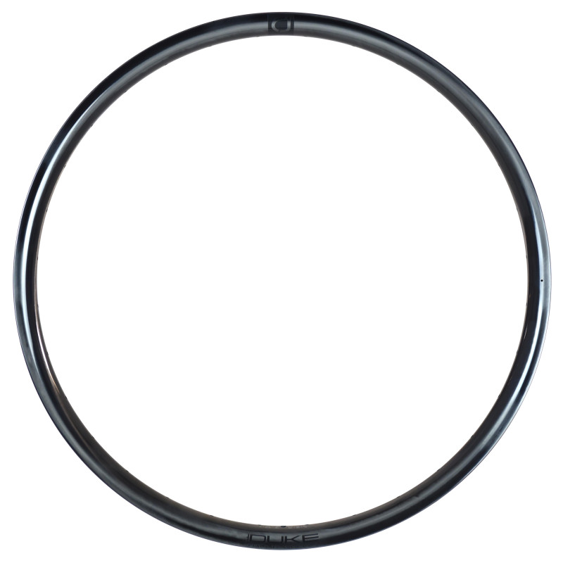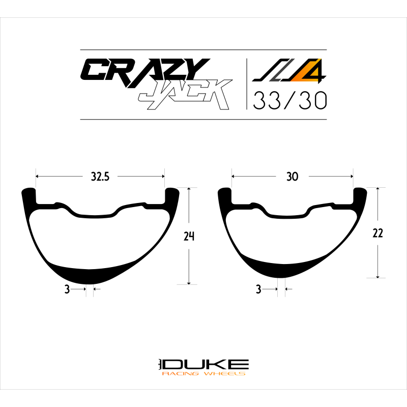 Comfort and grip thanks to a larger volume of air. It offers unrivaled lateral stiffness / weight ratio in its class and provides unusual sensations. Designed, developed and tested in France, The DUKE Crazy Jack in carbon has an ASYMMETRICAL profile (offset of 3 mm) which allows to increase the lateral stiffness of the wheel without gaining weight. The internal width between the hooks / sides is 32,5 mm. This gives more volume to the tires and improves efficiency, comfort and grip in turns.A wide rim also means that you can use finer, lighter tires while maintaining the comfort, softness and grip provided by a larger volume of air. Hookless design: the robustness of the rim is superior to that of a carbon rim with hooks. This technology has been used successfully on our rims since 2011. The height of the rim edge for 2015 is reduced by 1mm to further limit any risk of contact with the ground. Lateral stiffness improved by 40% compared to the previous version. Impact-resistant even on the most brittle ground: improved impact energy absorption of more than 50% compared to the previous model. Anti-burp system: the heel of the tire is held in position whatever its pressure, no risk of "unseating". Tubeless or inner tube.
