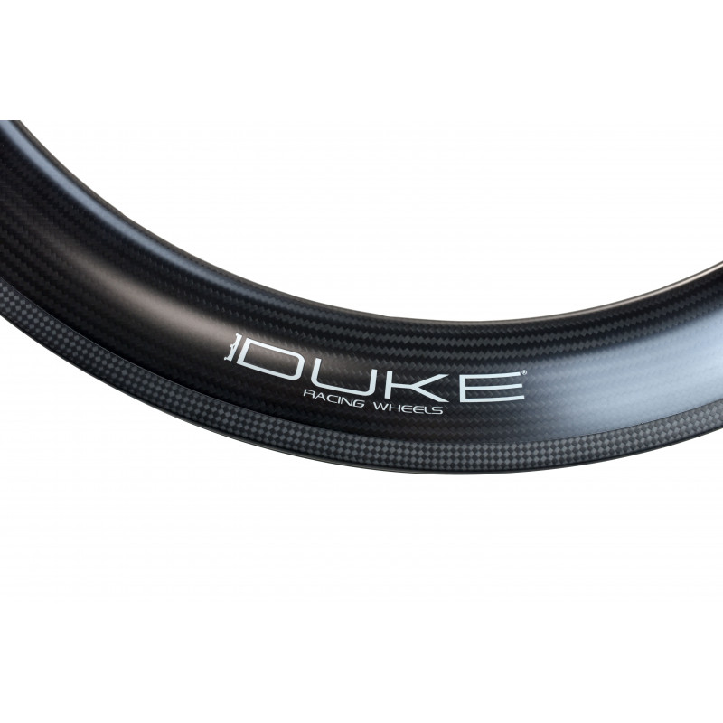 The DUKE carbon Rim (3k) twill 2x2, draw, developed and tested in Vendée (France), and made in Europe. The DUKE carbon rim baccara 65T have a 65 mm profile height and an important width of 26 mm :they are modern widths. This allow to reduce aerodynamic drag and increase speed.