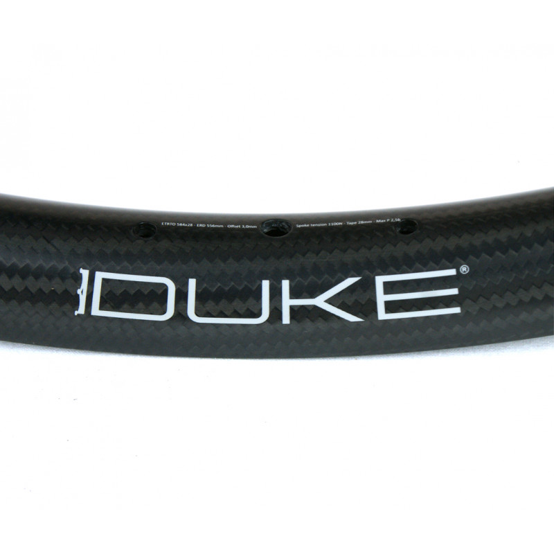 Comfort and grip thanks to a larger volume of air. It offers unrivaled lateral stiffness / weight ratio in its class and provides unusual sensations. Designed, developed and tested in France, The DUKE Crazy Jack in carbon has an ASYMMETRICAL profile (offset of 3 mm) which allows to increase the lateral stiffness of the wheel without gaining weight. The internal width between the hooks / sides is 28.5 mm. This gives more volume to the tires and improves efficiency, comfort and grip in turns.A wide rim also means that you can use finer, lighter tires while maintaining the comfort, softness and grip provided by a larger volume of air. Hookless design: the robustness of the rim is superior to that of a carbon rim with hooks. This technology has been used successfully on our rims since 2011. The height of the rim edge for 2015 is reduced by 1mm to further limit any risk of contact with the ground. Lateral stiffness improved by 40% compared to the previous version. Impact-resistant even on the most brittle ground: improved impact energy absorption of more than 50% compared to the previous model. Anti-burp system: the heel of the tire is held in position whatever its pressure, no risk of "unseating". Tubeless or inner tube.