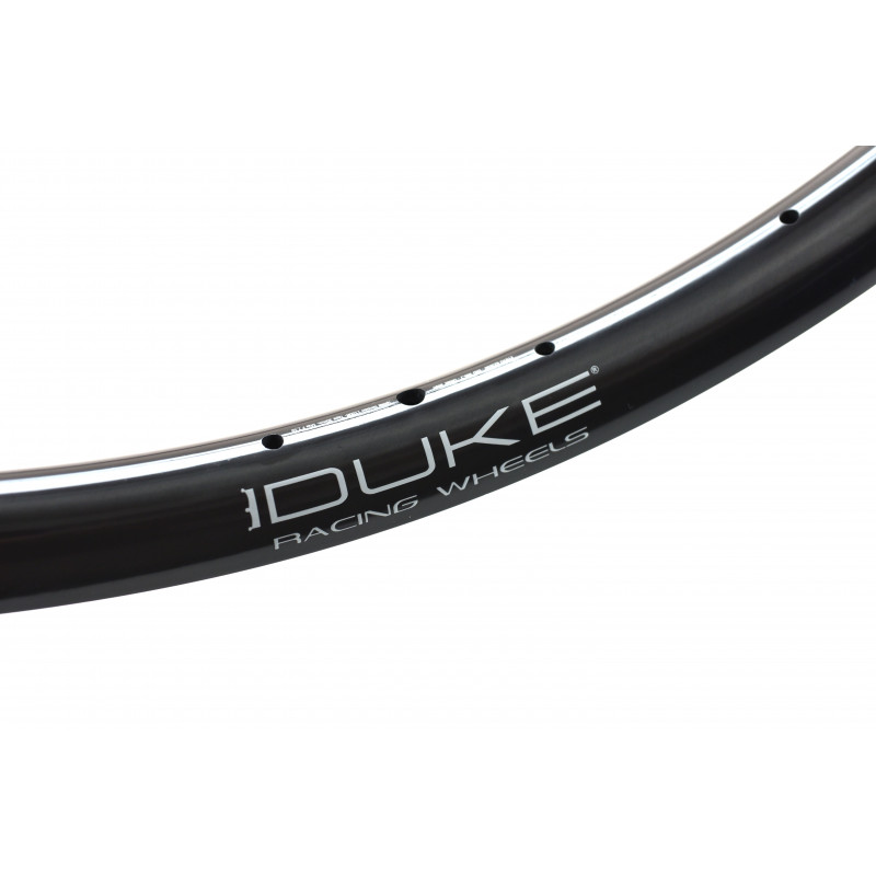 Comfort and grip thanks to a larger volume of air. It offers unrivaled lateral stiffness / weight ratio in its class and provides unusual sensations. Designed, developed and tested in France, The DUKE Crazy Jack in carbon has an ASYMMETRICAL profile (offset of 3 mm) which allows to increase the lateral stiffness of the wheel without gaining weight. The internal width between the hooks / sides is 30 mm. This gives more volume to the tires and improves efficiency, comfort and grip in turns.A wide rim also means that you can use finer, lighter tires while maintaining the comfort, softness and grip provided by a larger volume of air. Hookless design: the robustness of the rim is superior to that of a carbon rim with hooks. This technology has been used successfully on our rims since 2011. The height of the rim edge for 2015 is reduced by 1mm to further limit any risk of contact with the ground. Lateral stiffness improved by 40% compared to the previous version. Impact-resistant even on the most brittle ground: improved impact energy absorption of more than 50% compared to the previous model. Anti-burp system: the heel of the tire is held in position whatever its pressure, no risk of "unseating". Tubeless or inner tube.