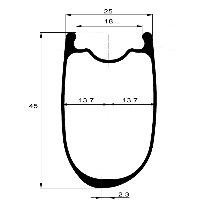 La jante DUKE Baccara 45C en carbone possède un profil ASYMÉTRIQUE à l’arrière: avec l’augmentation du nombre de vitesses, la flasque côté cassette du moyeu se voit de plus en plus «poussée» vers l’intérieur de la roue. Le parapluie des rayons s’ouvre ainsi davantage et ceci a pour conséquence la réduction de la rigidité latérale de la roue : celle-ci est floue dans les relances, prend du voile facilement… Pour réduire ce phénomène nous avons dessiné une jante arrière asymétrique qui va donner un parapluie bien supérieur aux jantes symétriques (offset de 2,3 mm) et va permettre de rééquilibrer les tensions des deux nappes : plus de rigidité et plus de durabilité. Largeur importante de 26mm : ce sont les largeurs modernes. Ceci permet de réduire la traînée aérodynamique et donc d’augmenter sa vitesse. Les roues sont également moins sensibles au vent latéral et la direction plus précise, le cycliste se sent plus en confiance. Largeur intérieure entre crochets/parois importante de 18 mm. Ceci donne davantage de volume aux pneus et améliore ainsi rendement, confort et adhérence dans les virages. Une jante large signifie également pouvoir utiliser des pneus plus fins et plus légers en conservant le confort, le moelleux et le grip procurés par un volume d’air plus important
