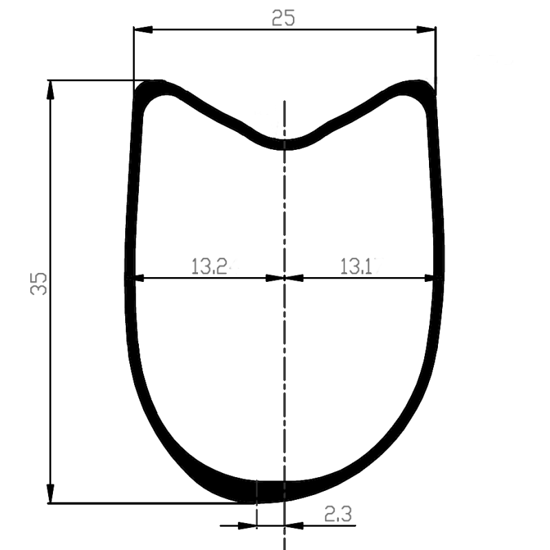 La jante DUKE Baccara 35T Disc en carbone possède un profil ASYMÉTRIQUE: avec l’augmentation du nombre de vitesses, la flasque côté cassette du moyeu se voit de plus en plus « poussée » vers l’intérieur de la roue. Le parapluie des rayons s’ouvre ainsi davantage et ceci a pour conséquence la réduction de la rigidité latérale de la roue : celle-ci est floue dans les relances, prend du voile facilement… Pour réduire ce phénomène nous avons dessiné une jante asymétrique qui va donner un parapluie bien supérieur aux jantes symétriques (offset de 2,3 mm) et va permettre de rééquilibrer les tensions des deux nappes : plus de rigidité et plus de durabilité. Largeur importante de 26mm : ce sont les largeurs modernes. Ceci permet de réduire la traînée aérodynamique et donc d’augmenter sa vitesse. Les roues sont également moins sensibles au vent latéral et la direction plus précise, le cycliste se sent plus en confiance. Pour boyaux (23 ou 25mm de large) : les boyaux de cette taille apportent rendement, confort et adhérence
