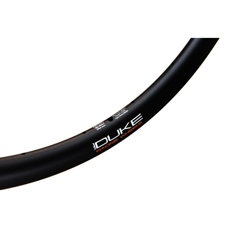 La jante DUKE Road runner X 30 disc est dessinée, testée en France, DUKE est le propriétaire exclusif des outils de fabrication. La jante DUKE Road Runner x 30 possède une hauteur profil de 30 mm. Profil ASYMÉTRIQUE : avec l’augmentation du nombre de vitesses, la flasque côté cassette du moyeu se voit de plus en plus « poussée » vers l’intérieur de la roue. Le parapluie des rayons s’ouvre ainsi davantage et ceci a pour conséquence la réduction de la rigidité latérale de la roue : celle-ci est floue dans les relances, prend du voile facilement… Pour réduire ce phénomène nous avons dessiné une jante arrière asymétrique qui va donner un parapluie bien supérieur aux jantes symétriques (offset de 2 mm) et va permettre de rééquilibrer les tensions des deux nappes : plus de rigidité et plus de durabilité. Largeur entre crochets importante de 21 mm : Ceci donne davantage de volume aux pneus et améliore ainsi rendement, confort et adhérence dans les virages. Une jante large signifie également pouvoir utiliser des pneus plus fins et plus légers en conservant le confort, le moelleux et le grip procurés par un volume d’air plus important.