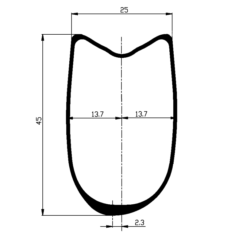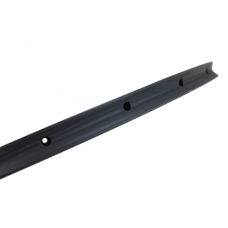 Jante DUKE en carbone (3k) sergé 2×2, dessinée, développée et testée chez nous en Vendée. La jante DUKE Baccara 45T en carbone possède un profil ASYMÉTRIQUE, avec le disque à l'avant et l’augmentation du nombre de vitesses, la flasque côté cassette du moyeu se voit de plus en plus « poussée » vers l’intérieur de la roue. Le parapluie des rayons s’ouvre ainsi davantage et ceci a pour conséquence la réduction de la rigidité latérale de la roue : celle-ci est floue dans les relances, prend du voile facilement… Pour réduire ce phénomène nous avons dessiné une jante asymétrique qui va donner un parapluie bien supérieur aux jantes symétriques (offset de 2,3 mm) et va permettre de rééquilibrer les tensions des deux nappes : plus de rigidité et plus de durabilité. Largeur importante de 26mm : ce sont les largeurs modernes. Ceci permet de réduire la traînée aérodynamique et donc d’augmenter sa vitesse. Les roues sont également moins sensibles au vent latéral et la direction plus précise, le cycliste se sent plus en confiance. Pour boyaux de 23 à 28mm de large (jusqu'à 33mm en cyclocross), les boyaux de cette taille apportent rendement, confort et adhérence.