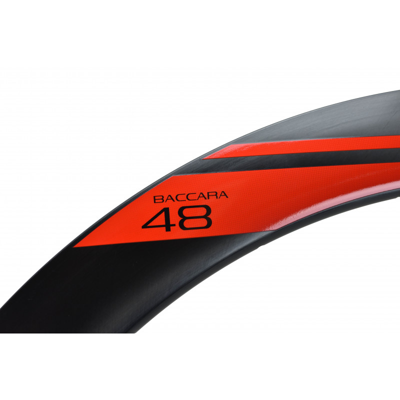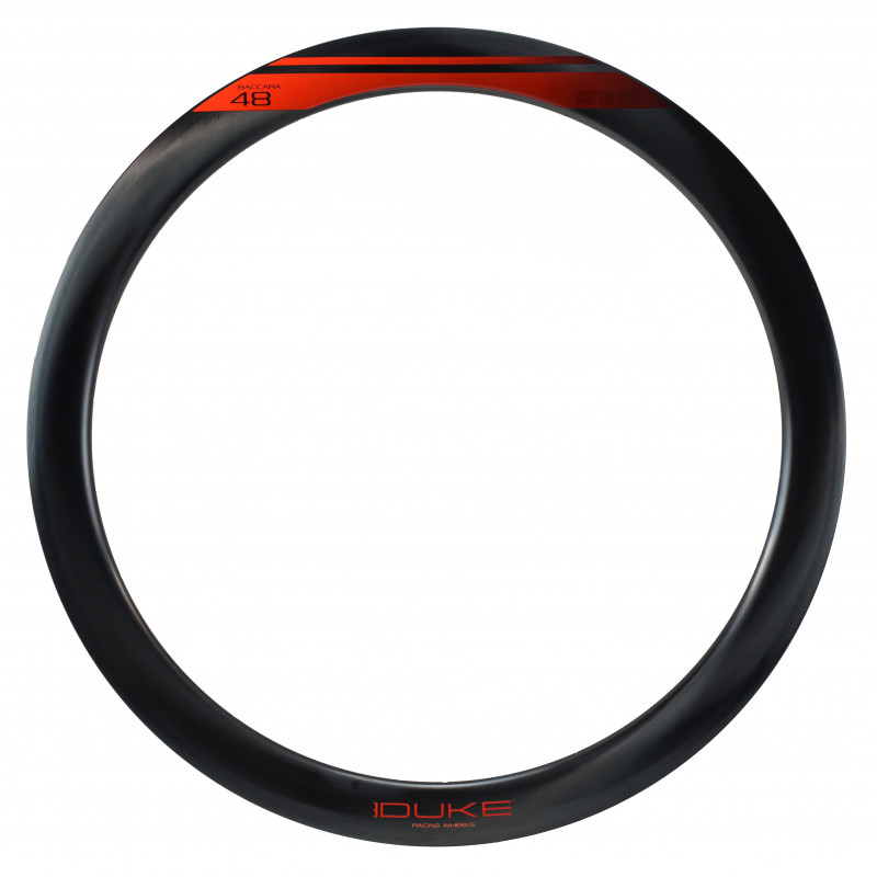 Nouvelle jante DUKE en carbone UD, dessinée, développée et testée en interne. Pour ses jantes, DUKE est propriétaire des outils de fabrication ! Les nouvelles jantes DUKE Baccara SLS2* sont la dernière évolution des incontournables Baccara 3K. Elles sont maintenant disponibles en 6 hauteurs: 36, 42, 48, 56, 65 et 78mm, freinage disque ou patins, profil symétrique ou asymétrique. Pour cette nouvelle génération, nous avons travaillé sur 3 points: le poids, le confort et l'aérodynamisme. Grace à la technologie SLS2 nous avons abaissé le poids de 10%, dû à l'usage de fibres haut module et d'un tout nouveau process de moulage en enceinte étanche avec des résines de nouvelle génération. Ce procédé permet également une meilleure filtration des vibrations engendrées par la granulométrie du bitume. Le confort s'en trouve amélioré. La largeur intérieure entre crochets est plus importante avec 21 mm. Ceci donne davantage de volume aux pneus et améliore ainsi rendement, confort et adhérence dans les virages. Une jante large signifie également pouvoir utiliser des pneus plus fins et plus légers en conservant le confort, le moelleux et le grip procurés par un volume d’air plus important. Les largeurs de pneus conseillées sont 25mm et 28mm, tubeless ou tubetype. Le profil de la jante a été retravaillé afin d'améliorer son aérodynamisme et sa stabilité dans toutes les conditions de vent. La largeur extérieure est plus importante avec 27,6 mm et possède une nouvelle forme en ogive. Ceci permet de réduire la traînée aérodynamique et donc d’augmenter sa vitesse. Les roues sont aussi moins sensibles au vent latéral et la direction plus précise, le cycliste se sent plus en confiance. Les meilleurs résultats sont obtenus avec des pneus de 25mm. Elle conserve également une version avec profil asymétrique de 2mm (pour les hauteurs de 36, 42 et 48mm). Avec l’augmentation du nombre de vitesses, la flasque côté cassette du moyeu se voit de plus en plus recentrée vers l’intérieur de la roue. Le parapluie des rayons s’ouvre davantage et ceci réduit la stabilité et la rigidité latérale de la roue : celle-ci est floue dans les relances, prend du voile facilement. L'asymétrie donne un parapluie bien supérieur aux jantes symétriques et permet de rééquilibrer les tensions des deux nappes pour plus de rigidité et plus de durabilité.
