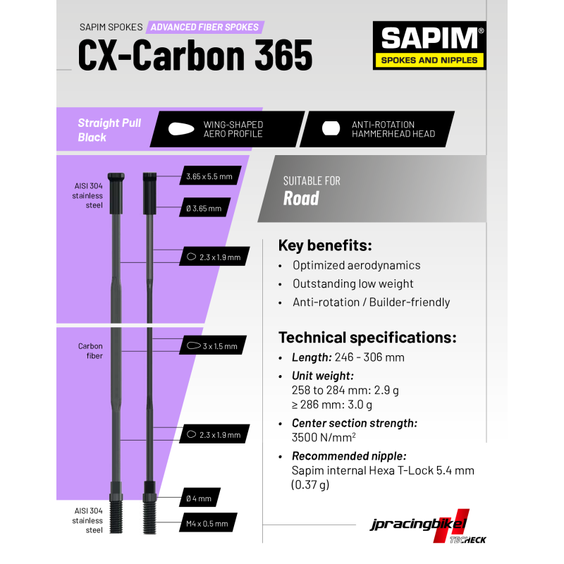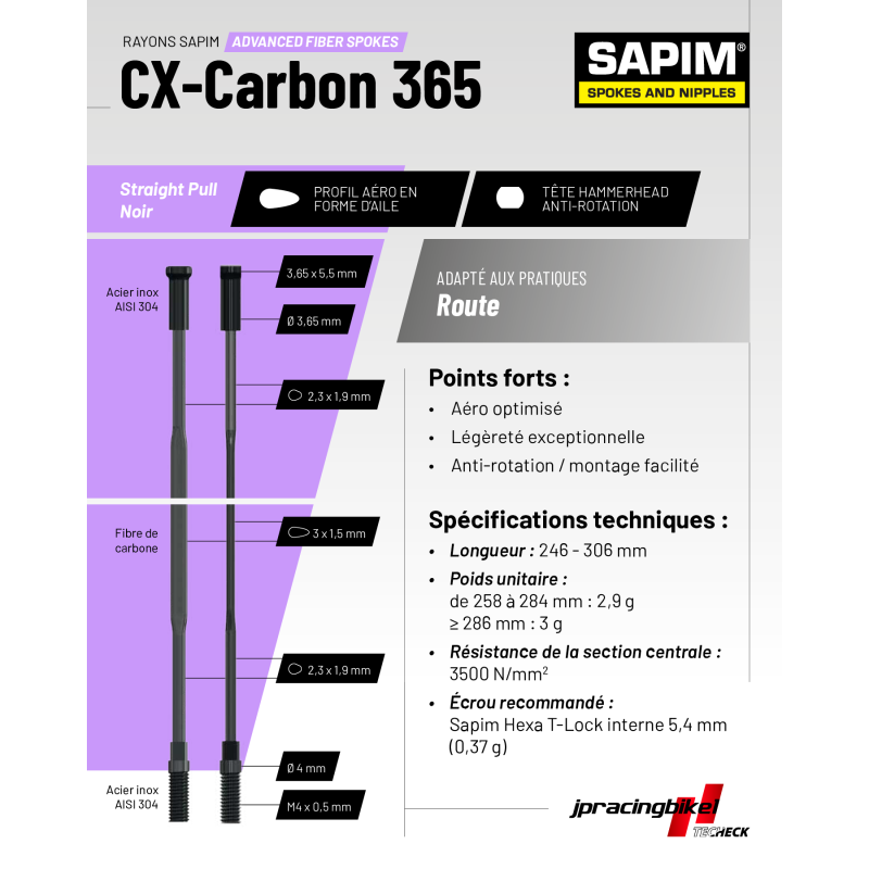 Le CX-Carbon 365 n’est pas la version standard du CX-Carbon. C'est une déclinaison spécifique développée à notre initiative avec Sapim, dotée d’une tête 3,65 × 5,5 mm différente du format standard 4,5 × 5,5 mm. Nous avons fait le choix de référencer exclusivement le CX-Carbon 365.
